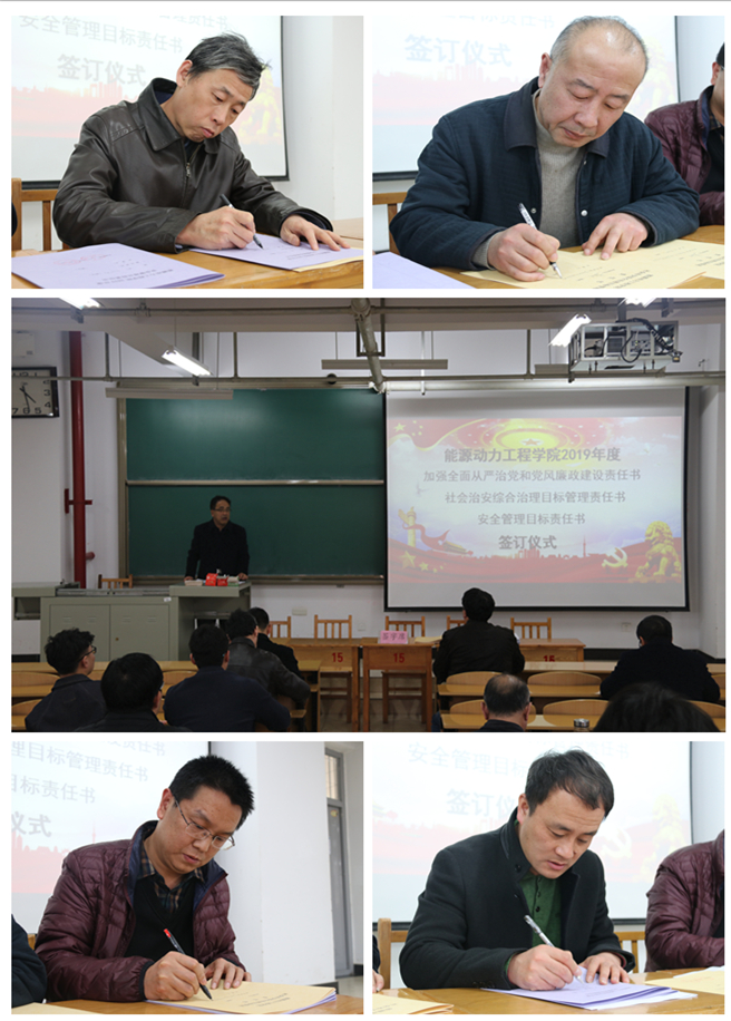 李书记指出,2019年学院工作的总体思路是党委领导、思想引领、问题导向、着力攻坚、全面提升,结合“双一流”建设奋斗目标,要重点做好“六个破除、六个着力、六个坚持”。要引导广大党员干部和师生把一流标准树立起来,做到学有榜样、干有动力、追有目标,紧紧围绕“改革创新、奋发有为”主题,把自己摆进去、把职责摆进去、把工作摆进去,对照“六个破除”找差距,定措施、明整改。随后,举行了加强全面从严治党和党风廉政建设责任书、社会治安综合治理目标管理责任书、安全管理目标责任书的签订仪式。