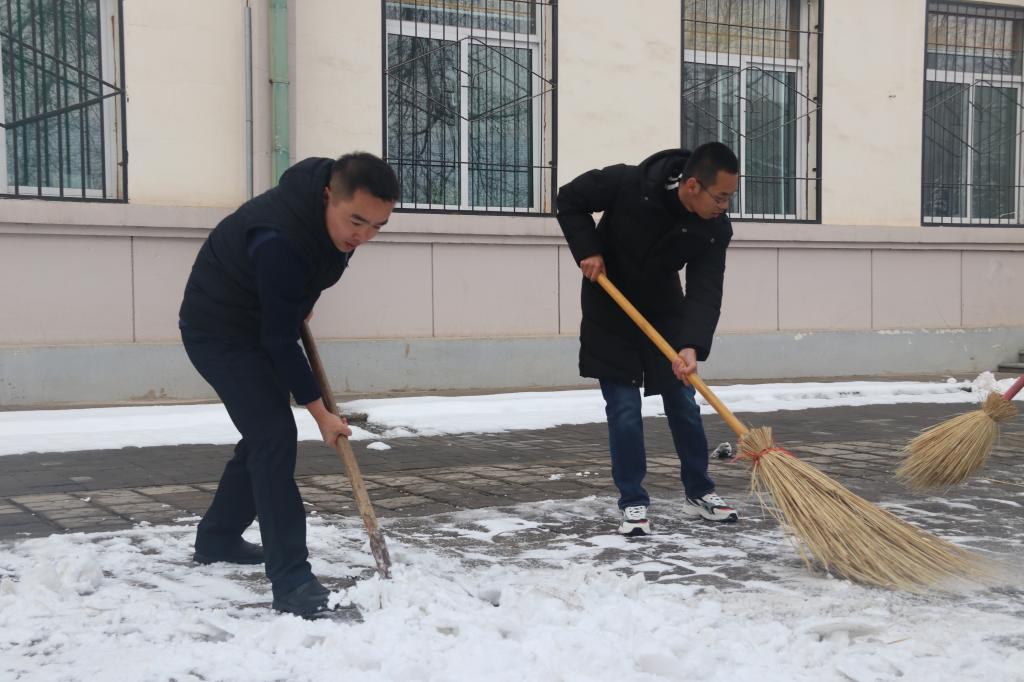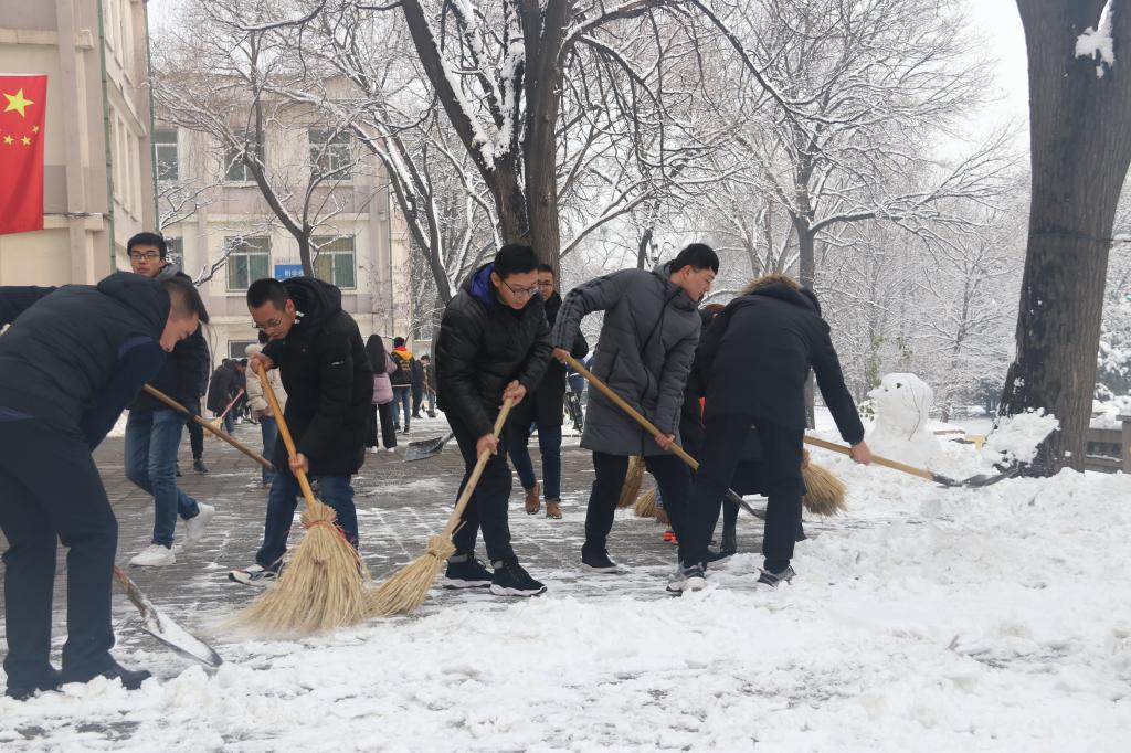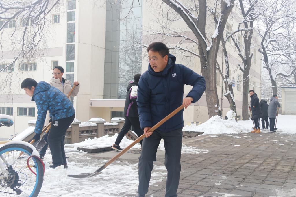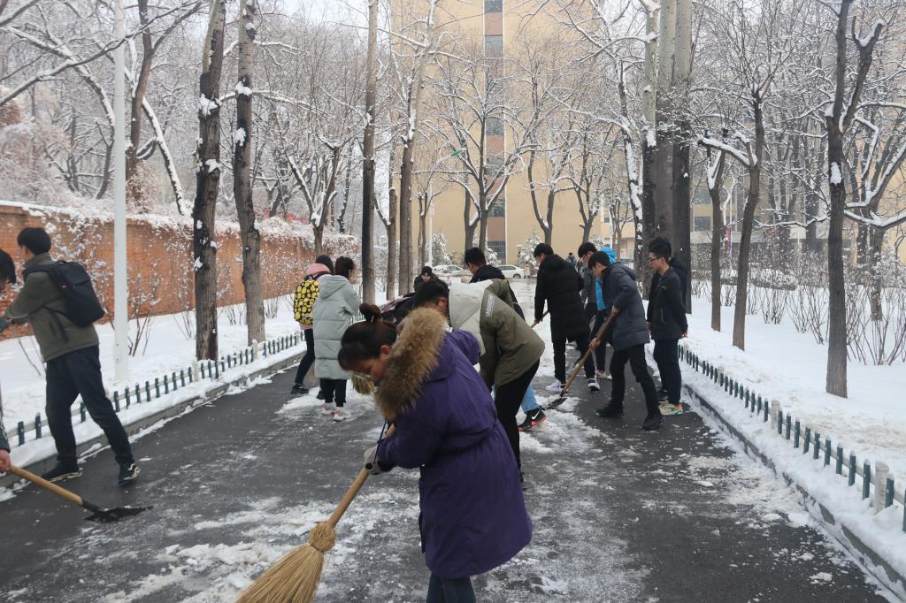 扫雪过程中,大家精神饱满、分工有序,将诚学楼周围、四号教学楼及铁道桥下区域的积雪清扫干净。大家不畏严寒,齐心协力,默契配合。经过一下午的奋战,道路变得干净通畅,消除了安全隐患。