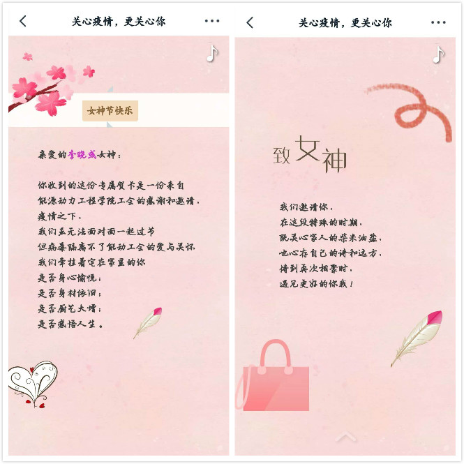 3月8日早上,学院女教工一打开手机就收到工会送来的一张精美的电子贺卡。为了将学院工会对女教工们“三八”妇女节的祝福和关爱,及时地传递给她们,学院工会特意为每一名女教工私人定制了一枚精美的电子祝福贺卡,收到贺卡的女教工都表示被这一暖心举动所深深打动,感谢学院工会的美好祝愿。