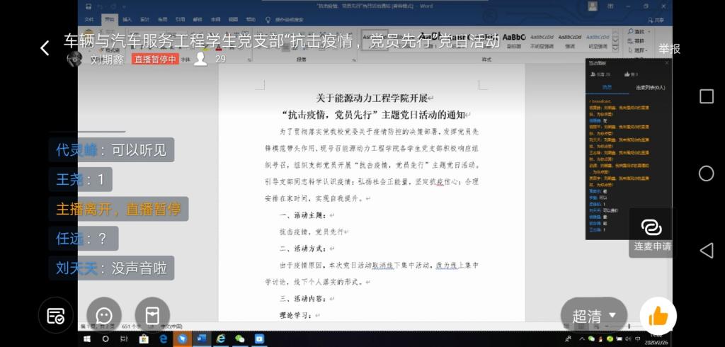 2月26日车辆与汽车服务工程学生党支部组织支部全体党员一起观看了新型冠状病毒肺炎防控视频资料。通过视频学习,支部成员进一步意识到此次疫情的严重性,并表示要以身作则,在做好自身防护的同时主动加入到疫情防控志愿服务中去。