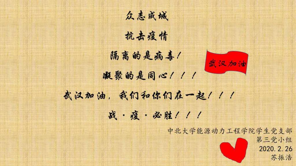 为进一步贯彻落实皇冠hg0086客户端校疫情防控工作的精神,提高党员的党性修养,发挥党员的先锋模范带头作用,皇冠hg0086客户端党委号召广大党员同志通过各种不同的形式积极开展防控工作,并组织各党支部于2020年2月下旬至3月上旬相继开展了“同心战疫,党员先行”的线上主题党日活动。有的支部书写了抗击疫情加油诗歌、有的支部拍摄了加油视频、还有的支部党员争当防疫志愿者,学院每一位党员在疫情防控工作中做到“主动有活干、主动有事做”。