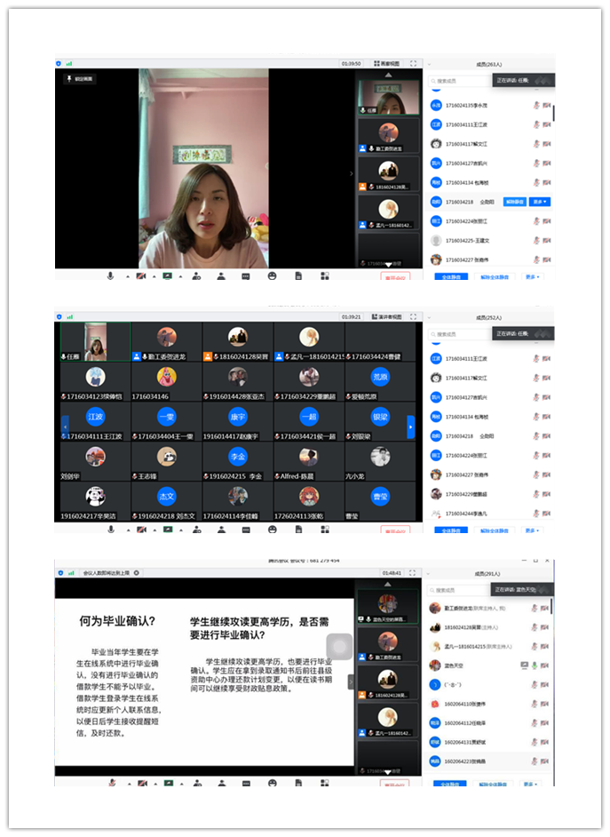 李清岩老师为同学们详细讲解了助学贷款的还款事宜,并为同学们在线答疑。毕业生们纷纷表示在今后的学习、工作、生活中会不忘初心,端正态度,诚信做人,砥砺前行。大会最后,李老师为同学们送出了:“乾坤未定,你皇冠hg0086客户端皆是黑马”的祝福。