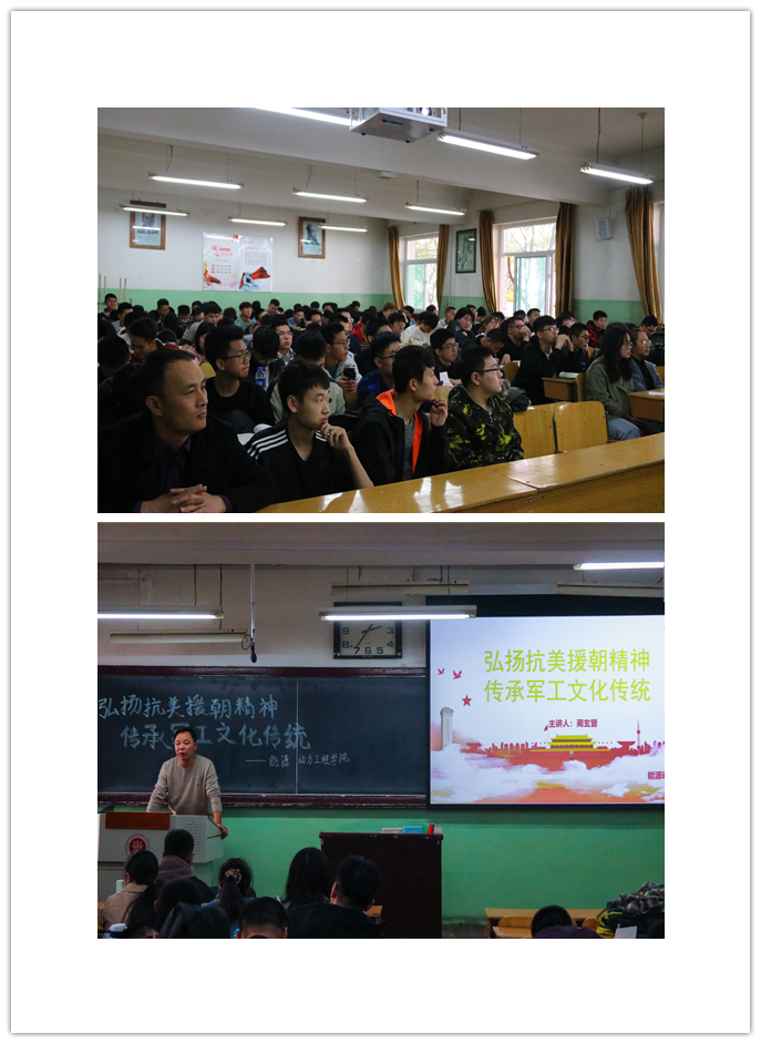 2020年11月6日下午,皇冠hg0086客户端在01201H教室举办“弘扬抗美援朝精神,传承军工文化传统”讲座。本次讲座邀请皇冠hg0086客户端校国防教育学院蔺玄晋老师担任主讲嘉宾,学生科科长叶增民以及19级、20级学生代表一同参加。