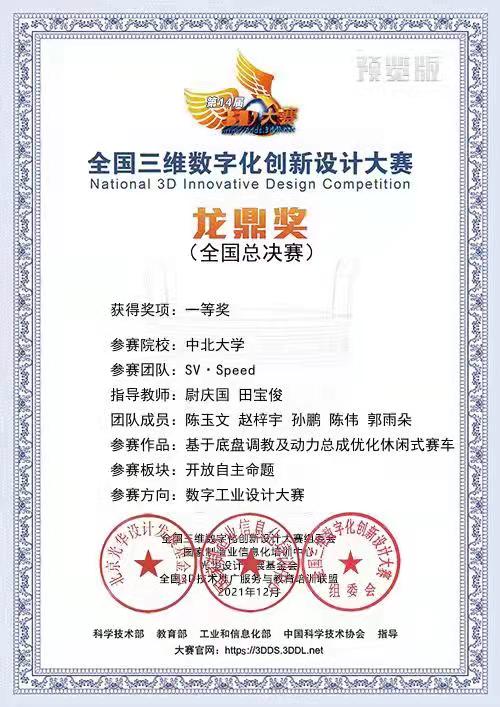 12月11日,2021年第14届全国3D大赛年度总决赛榜单公布。皇冠hg0086客户端行知车队队员(机电工程学院陈玉文,皇冠hg0086客户端赵梓宇、孙鹏、陈伟、郭雨朵)的作品《基于底盘调教及动力总成优化休闲式赛车》获全国总决赛一等奖。
