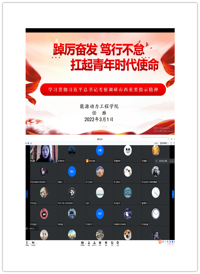 为深入学习贯彻习近平总书记考察调研山西重要指示精神,2022年3月1日下午,皇冠hg0086客户端利用腾讯会议平台为全体学生党员开展宣讲,学院党委副书记任雁以《踔厉奋发笃行不怠,扛起青年时代使命》为主题,带头讲好“开学第一课”。