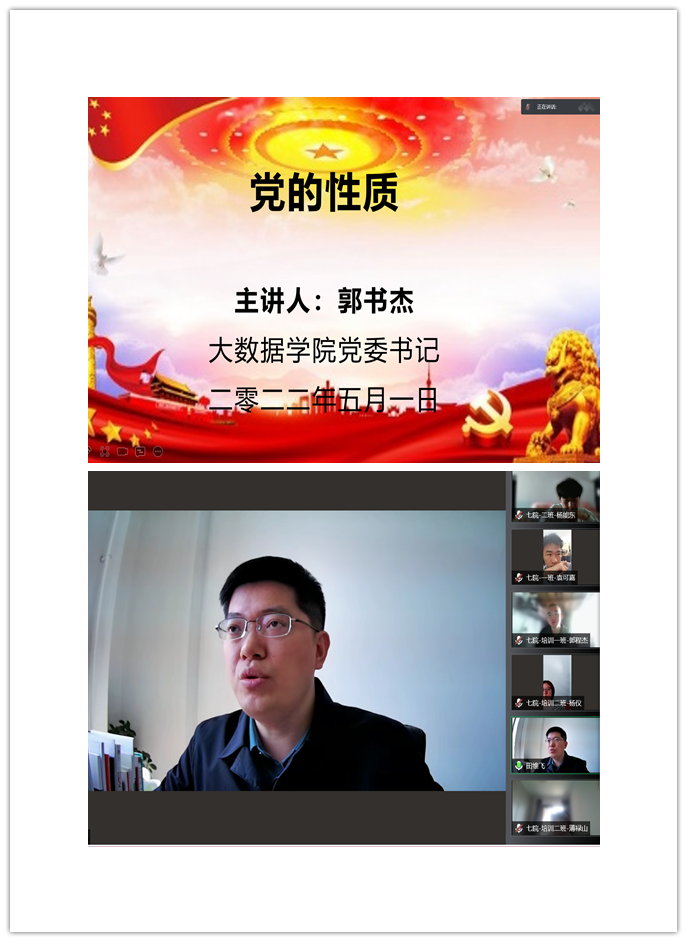 大数据学院党委书记郭书杰老师以“党的性质”为题,对中国共产党的性质进行了深入的阐述,他鼓励同学们积极向党组织靠拢,主动向党组织汇报,对标学习和生活中的优秀学生,向优秀看齐。