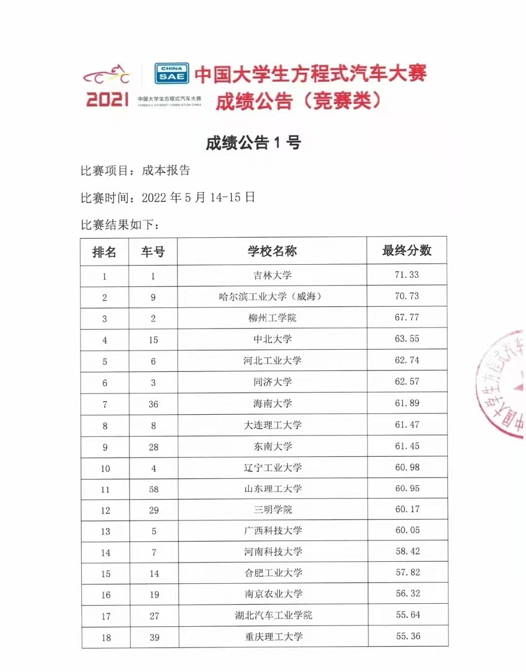 皇冠hg0086客户端皇冠hg0086客户端行知车队获得了总成绩排名12的优秀成绩,成功荣获全国二等奖;其中成本报告项目中排名第4。成本报告荣誉再现,比赛成绩再创新高!
