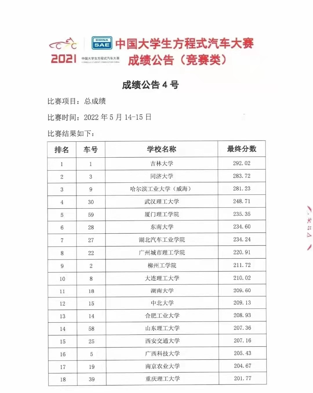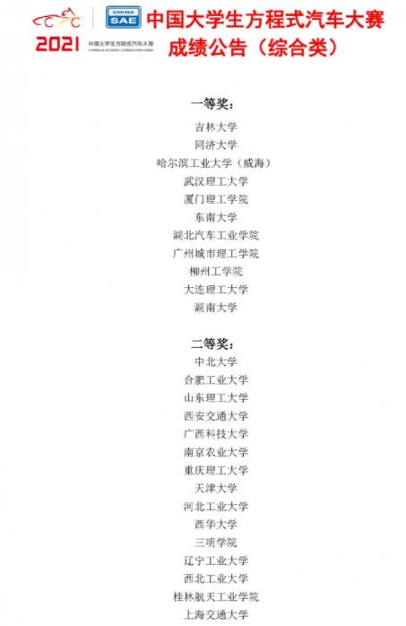 2022年5月14日-6月3日,由中国科学技术协会指导、中国汽车工程学会主办的2021中国大学生方程式系列赛事(FSC)于线上举行。6月19日,颁奖典礼在北京举办。6月20日,发布了成绩公告。
